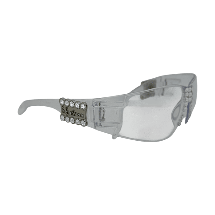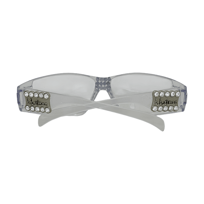 The matching embellished temples display an embossed logo between two rows of crystals.