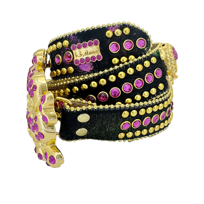 A bold pattern made up of 2 rows of gold spike studs and 1 row of hot pink Swarovski crystals run parallel along the strap.