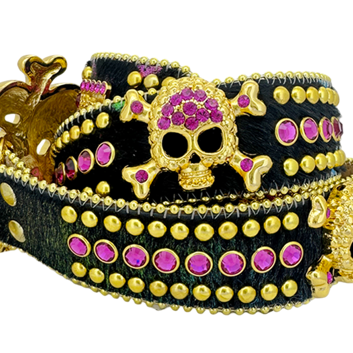 The buckle is fabulous, with four glam skulls forming the gold metal buckle and bright multi-color
