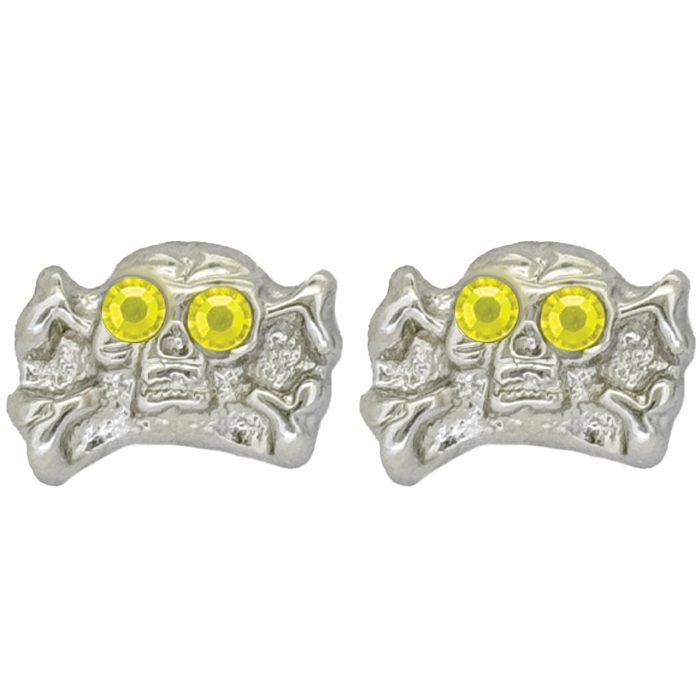 The silver-tone skull n bones earrings, set with 2 Jet Citrine Swarovski crystals as the eyes, feature our customised butterfly-back fastenings and an orb-shaped silhouette.