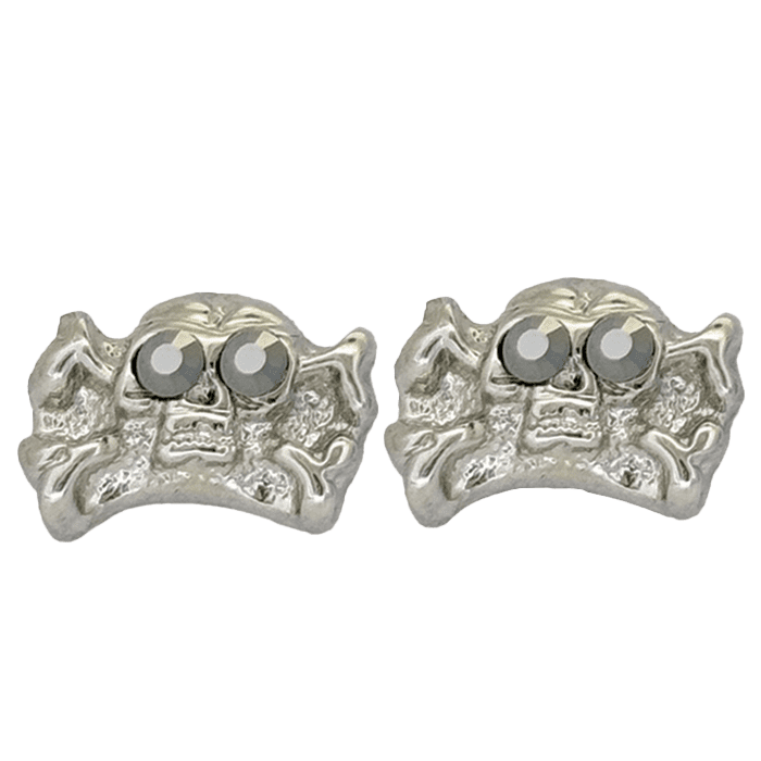 The silver-tone skull n bones earrings, set with 2 Jet Hematite Swarovski crystals as the eyes, feature our customised butterfly-back fastenings and an orb-shaped silhouette.